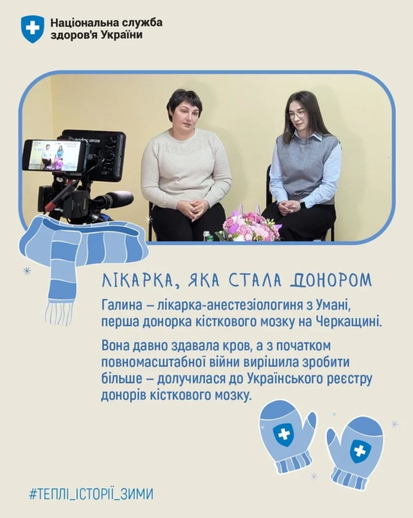 Галина — лікарка-анестезіологиня з Умані, яка увійшла в історію Черкаської області як перша донорка кісткового мозку в регіоні.  Донорство для неї не було чимось випадковим: ще до війни вона регулярно здавала кров. А з початком повномасштабного вторгнення відчула, що хоче зробити щось  більше.